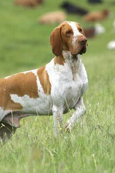 At one time, there were two distinct types of Bracco Italiano: One type, the white-and-orange Piedmontese from Piemont, was described as being light boned, very similar to the French short haired pointing, and most suited to work in the mountains. The other type was the heavier, roan-and-brown colored Lombardict with the jaunty gallop, a dog bred in Lombardia and better equipped to hunt marshy lowlands.